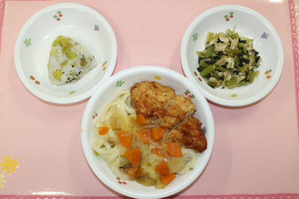 あんかけうどん 鶏ささみの天ぷら 小松菜の煮浸し バナナ