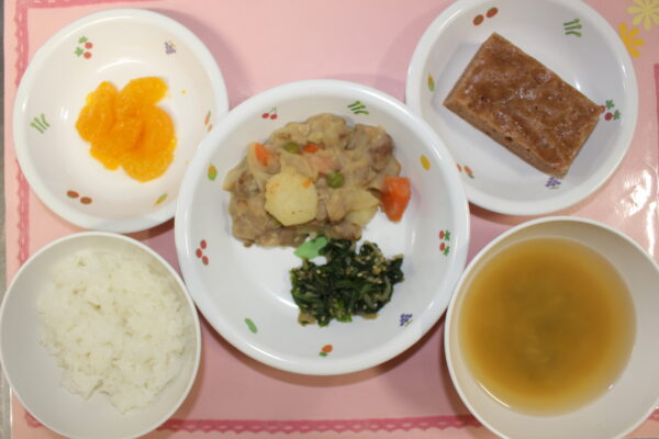 肉じゃが ほうれん草のごまサラダ 味噌汁 みかん缶