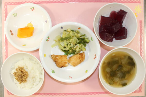 メカジキの竜田揚げ きゃべつのごま和え 納豆 味噌汁 柿