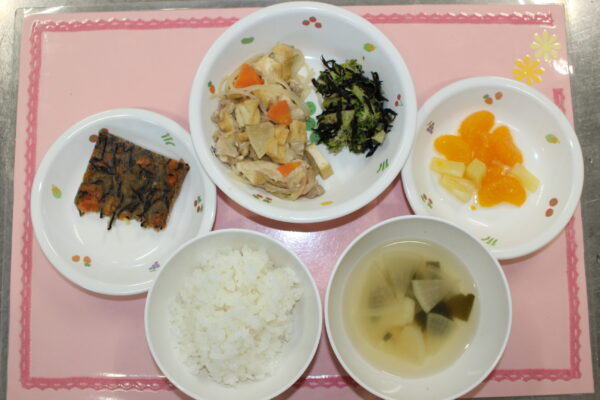 ごはん 厚揚げと豚肉の味噌煮 ブロッコリーとひじきのソテー すまし汁 みかん缶