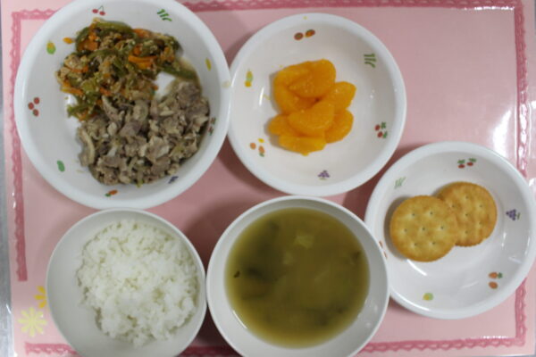 ごはん 豚肉の香味焼き ピーマンのツナ和え みそ汁 みかん缶
