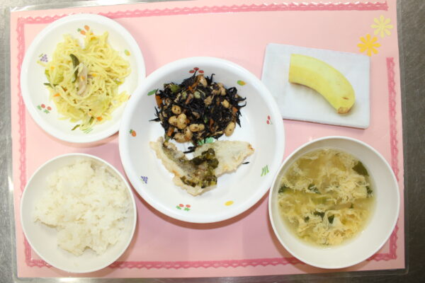 ごはん タラの薬味ソースかけ ひじきの煮物 かきたま汁 バナナ