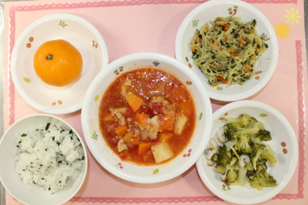 わかめご飯 ミートボールのトマト煮込み ブロッコリーとちくわのサラダ みかん