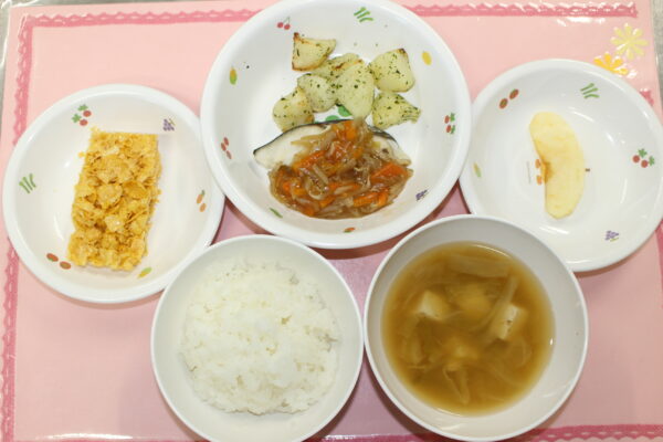 ごはん 鰆のもやしあんかけ ベイクドじゃが みそ汁 りんご