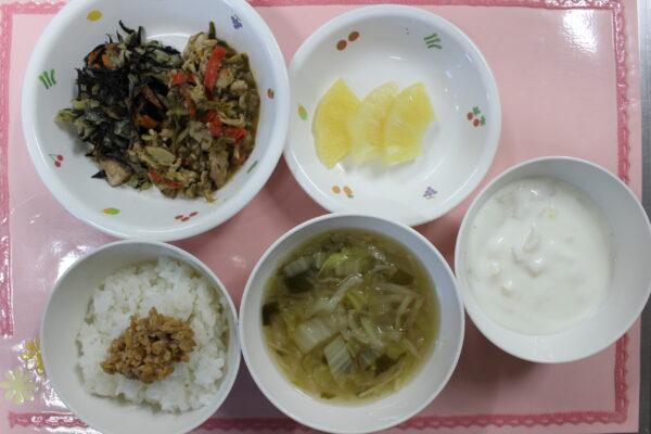 ご飯 豚肉と昆布の炒め物 ひじきの煮物 納豆 味噌汁 パイン缶