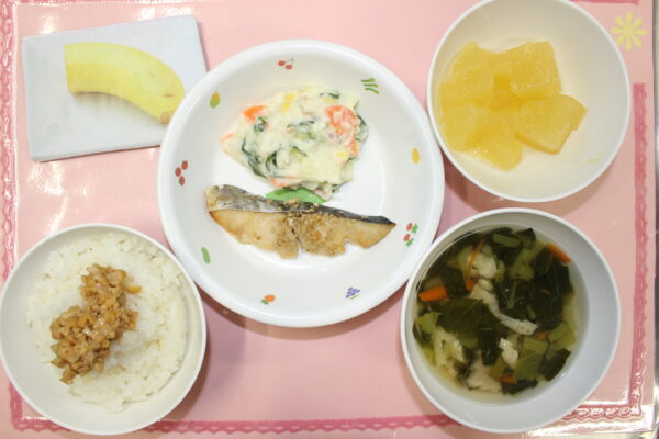 御飯 さわらのごま焼き ポテトサラダ 納豆 煮浸し風椀 バナナ