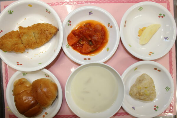 ぶどうパン 白身魚のフライ ラタトゥイユ コーンクリームスープ りんご