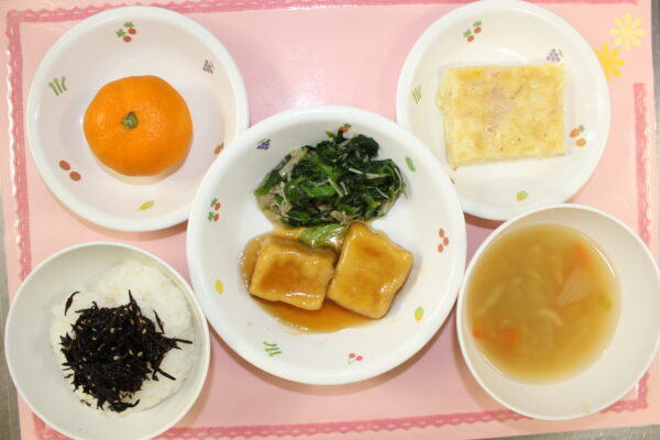御飯 高野豆腐のオランダ煮 ほうれん草とえのき茸のおひたし