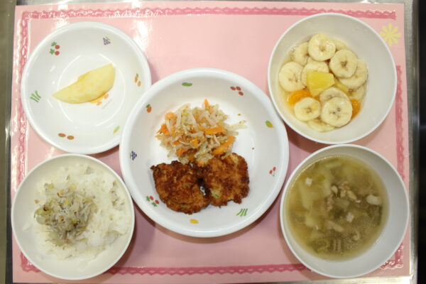御飯 豆腐のふわとろボール もやしのごま塩和え しらすふりかけ 味噌汁 りんご