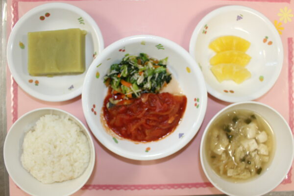 御飯 さばのトマト煮 小松菜とえのきのお浸し みそ汁 パイン缶