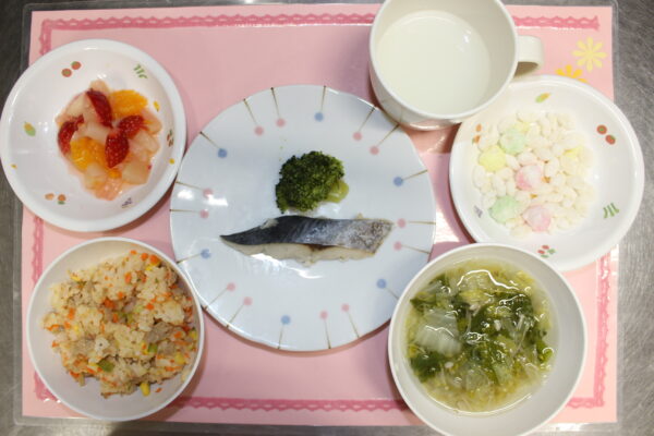 ちらし寿司 さわらの塩焼き ゆでブロッコリー 果物の盛り合わせ すまし汁