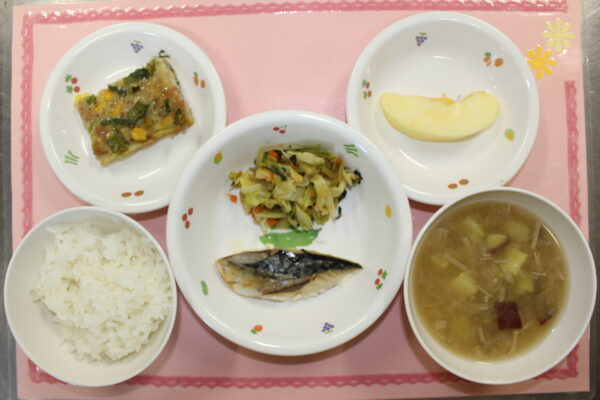 御飯 鯖の塩焼き キャベツのおかか和え みそ汁 りんご