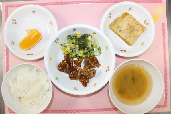 御飯 レバーの胡麻ソースからめ ブロッコリーとコーンのサラダ みそ汁 オレンジ
