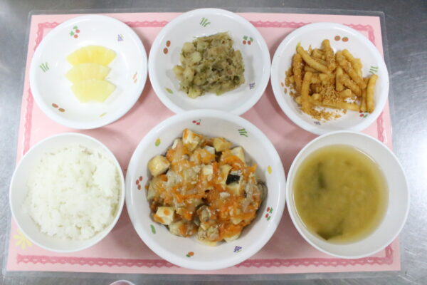 御飯 厚揚げの炒め物 じゃがいもとしらすのおかか和え みそ汁 パイン缶 ~おやつ~ マカロニきな粉