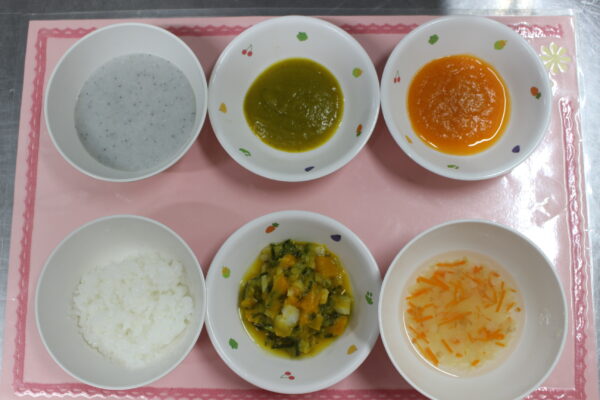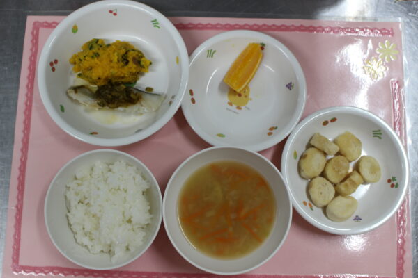 投稿日: 2026年4月9日 投稿者: 給食ブログめばえ保育園4月9日の献立 上段(初期)5分粥 しらすと野菜の煮物 下段(後期)軟飯 たらと野菜の煮物 野菜スープ オレンジ御飯 たらの薬味ソースがけ かぼちゃサラダ みそ汁 オレンジ ~おやつ~ お麩ラスク