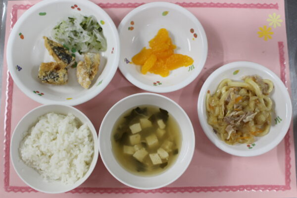 投稿日: 2026年4月13日 投稿者: 給食ブログめばえ保育園4月13日の献立 (後期)軟飯 さわらと野菜の煮物 野菜スープ御飯 さわらの竜田揚げ 大根の甘酢漬け みそ汁 みかん缶 ~おやつ~ 焼きうどん
