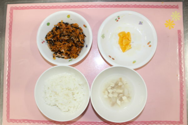 投稿日: 2026年4月24日 投稿者: 給食ブログめばえ保育園4月24日の献立 (後期)御飯 鮭と野菜の煮物 野菜スープ オレンジロールパン 鮭のマヨネーズ焼き ひじきの煮物 豚汁 オレンジ ~おやつ~ ツナやさいおにぎり