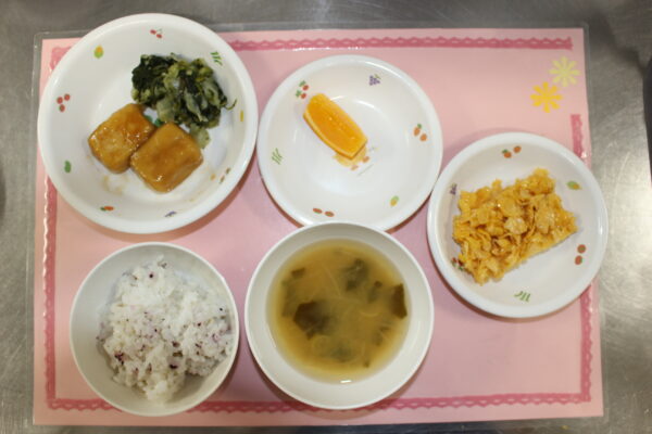 下段(後期)御飯 豆腐と野菜の煮物 野菜スープ オレンジゆかりご飯 高野豆腐のオランダ煮 キャベツとほうれん草の和え物